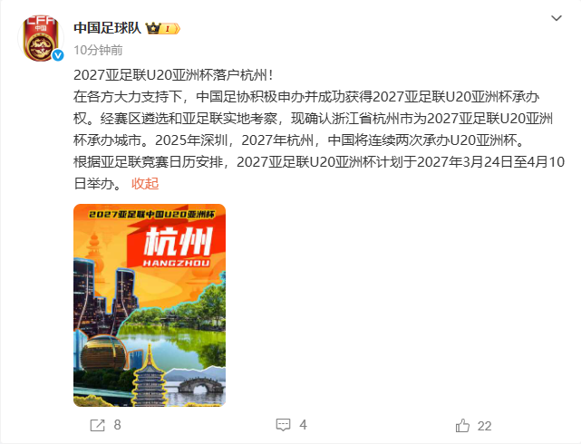 在各方大力支持下,中国足协积极申办并成功获得2027亚足联U20亚洲杯承办权。经赛区遴选和亚足联实地考察,现确认浙江省杭州市为2027亚足联U20亚洲杯承办城市。2025年深圳,2027年杭州,中国将连续两次承办U20亚洲杯。