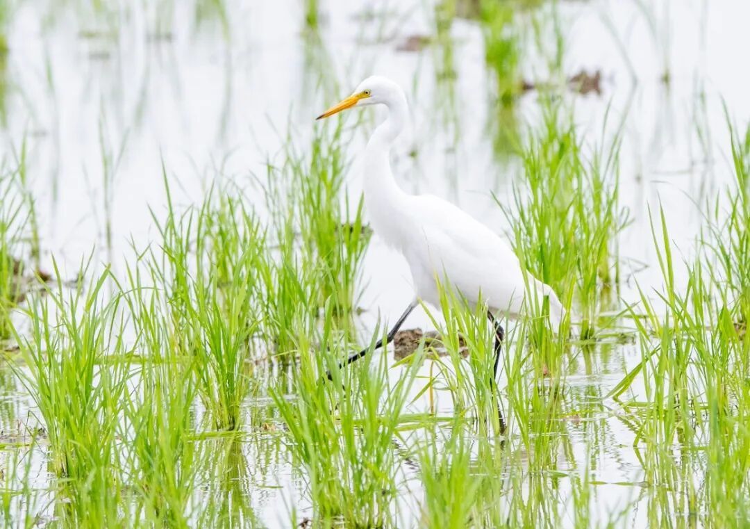 中白鹭通常于浅滩静立觅食,精准捕捉小鱼泥鳅,经常出现在稻田中,偶尔与小白鹭、苍鹭组团“巡湖”。