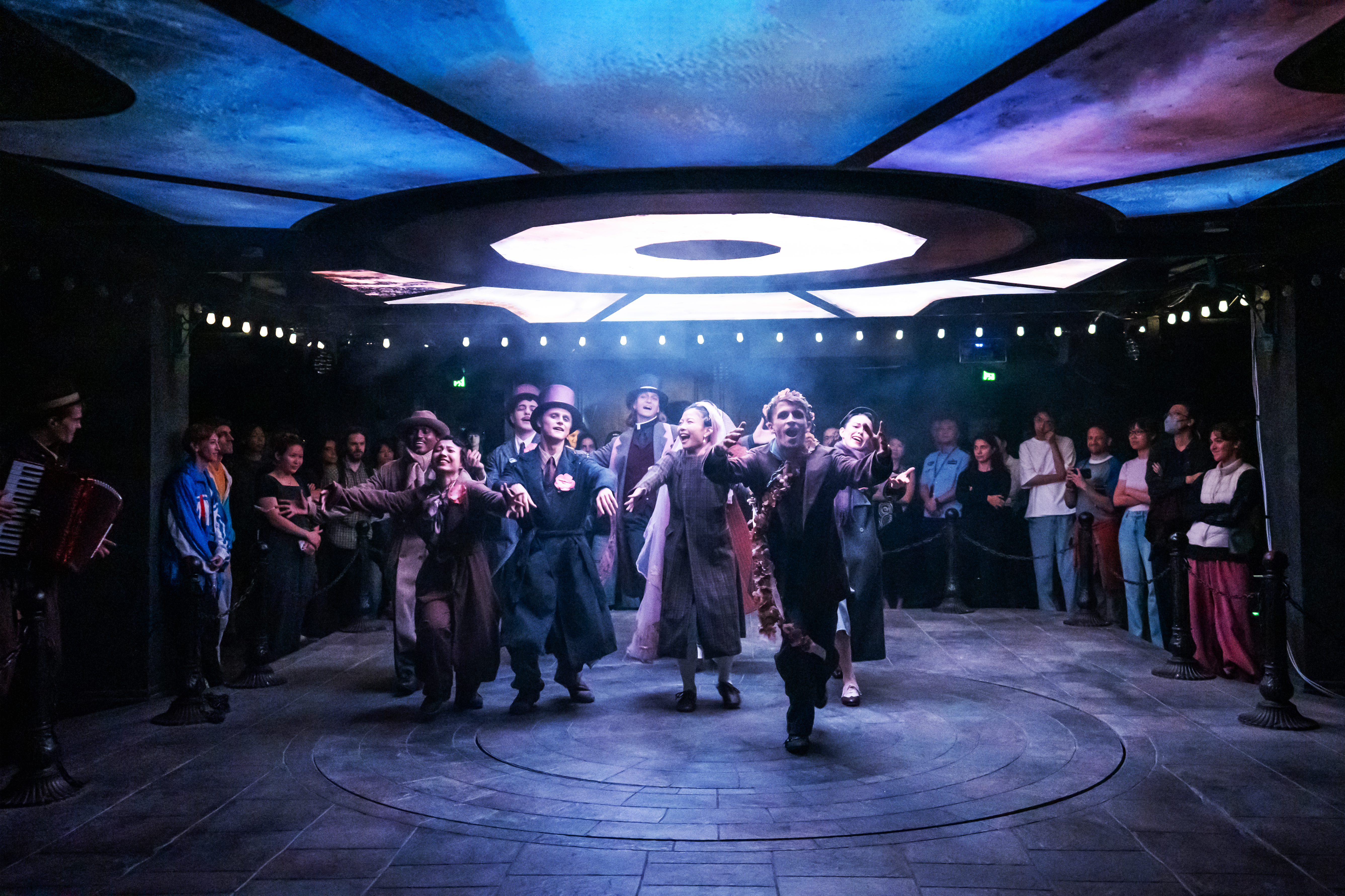在场景方面,创作团队精心设计了8个场景,每个场景又有若干个独立空间,观众可以自由穿梭于36个演员之间,甚至与乐手互动、与角色共饮。