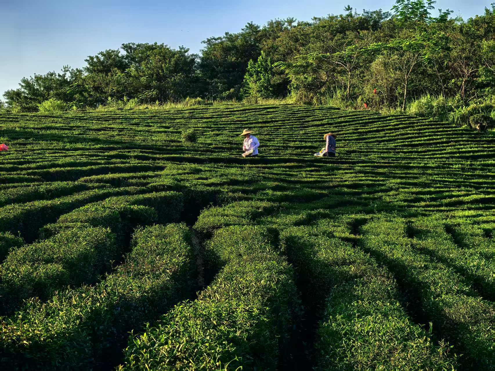 9月22日,在万亩茶园,成片的茶树如绿色的波浪般绵延起伏,空气中弥漫着清新的茶香。十余位茶农们头戴斗笠、腰挎竹篓,分散在茶园的各个角落,熟练地采摘着符合标准的嫩芽。