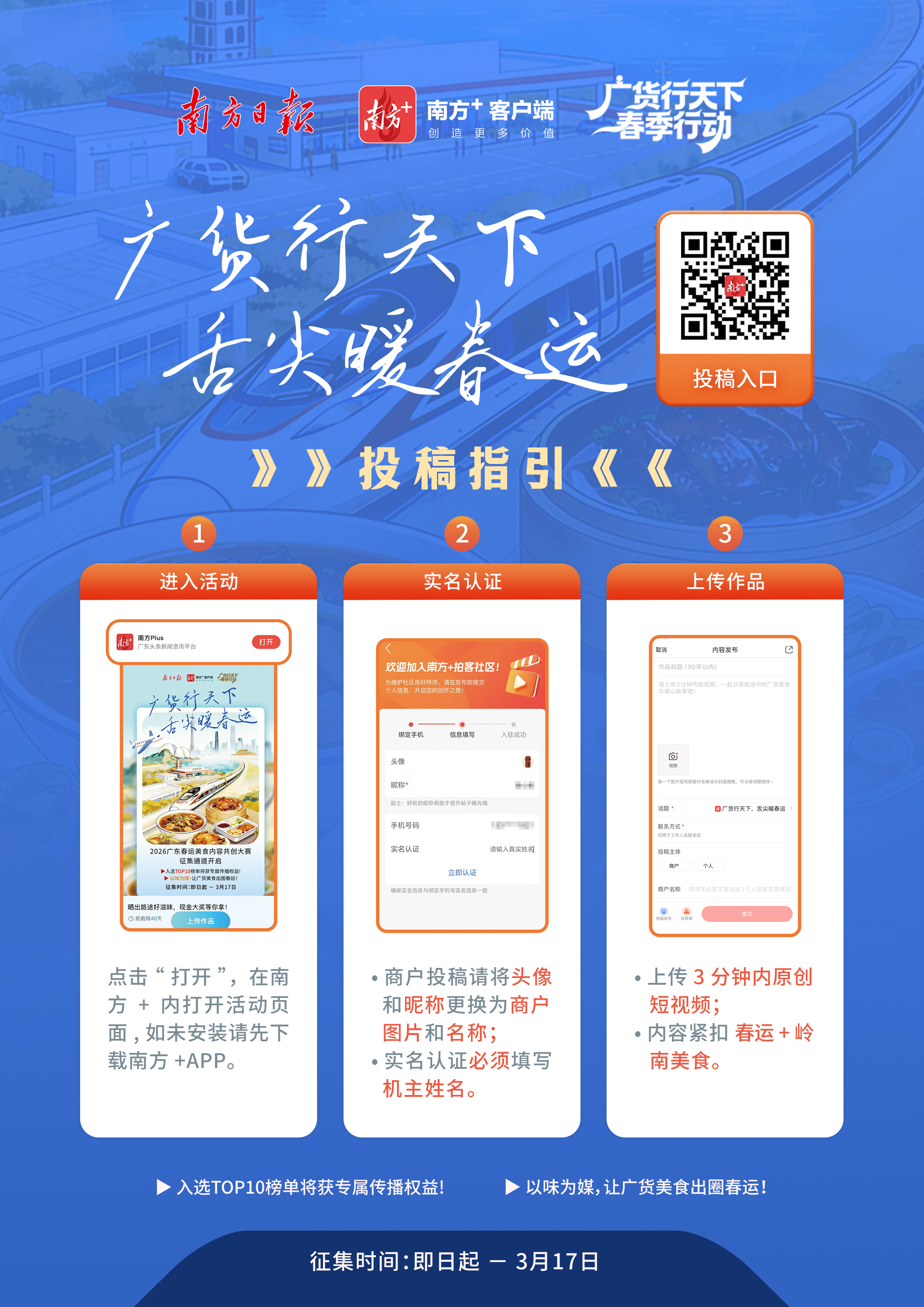 即日起,登录南方+客户端,进入南方+拍客社区,在“广货行天下,舌尖暖春运”话题页面完成投稿。