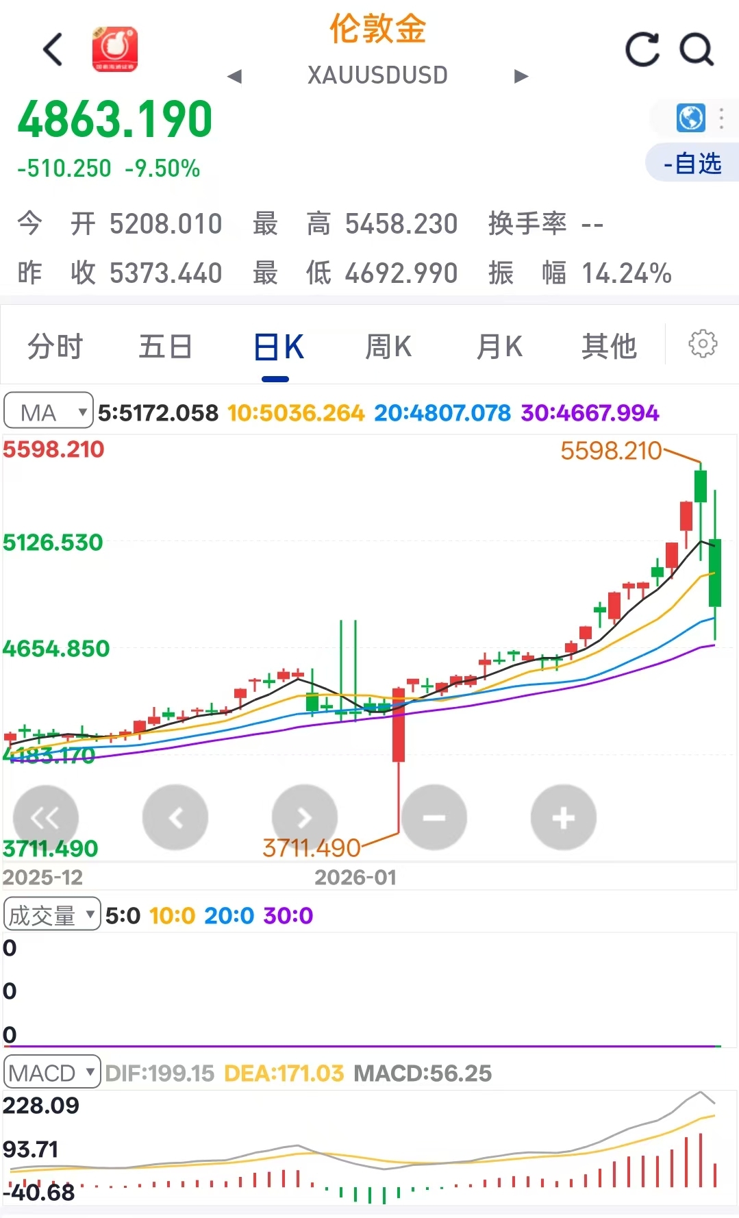 暴跌并未就此止步。1月31日,市场恐慌情绪延续,现货黄金盘中最大跌幅一度扩至12%,最低下探至4682美元;现货白银更是创下历史最大日内跌幅,一度跌超36%。截至2月1日发稿时,市场仍处于剧烈震荡与消化之中,如伦敦金最高峰与大跌的低点算,伦敦高金较峰值已回落逾16.16%。