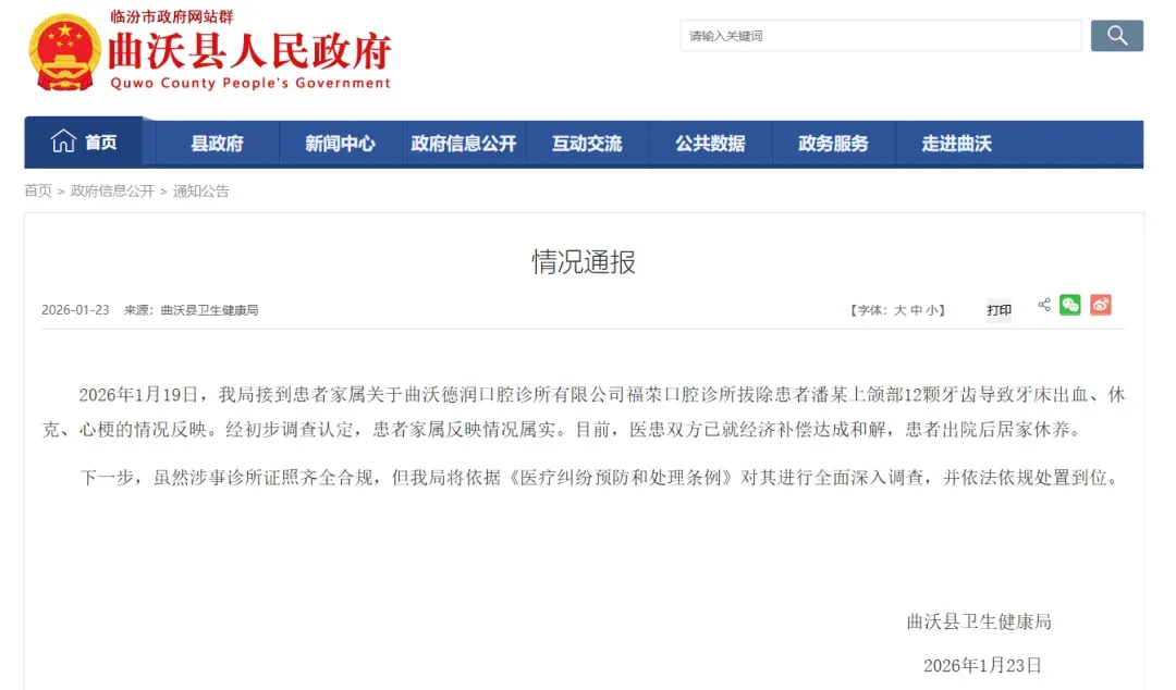 1月19日,我局接到患者家属关于曲沃德润口腔诊所有限公司福荣口腔诊所拔除患者潘某上颌部12颗牙齿导致牙床出血、休克、心梗的情况反映。经初步调查认定,患者家属反映情况属实。目前,医患双方已就经济补偿达成和解,患者出院后居家休养。