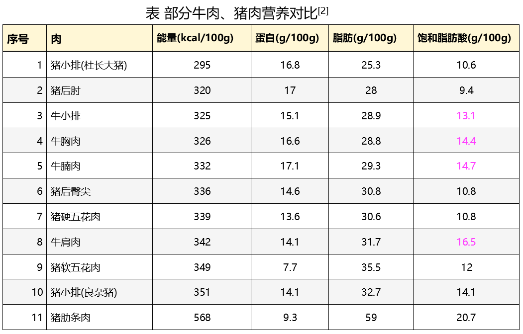 1、上面这 11 种肉中,很明显牛肉的饱和脂肪酸含量更高,所以仅从这一点来说,也不能笼统地说牛肉比猪肉更健康。