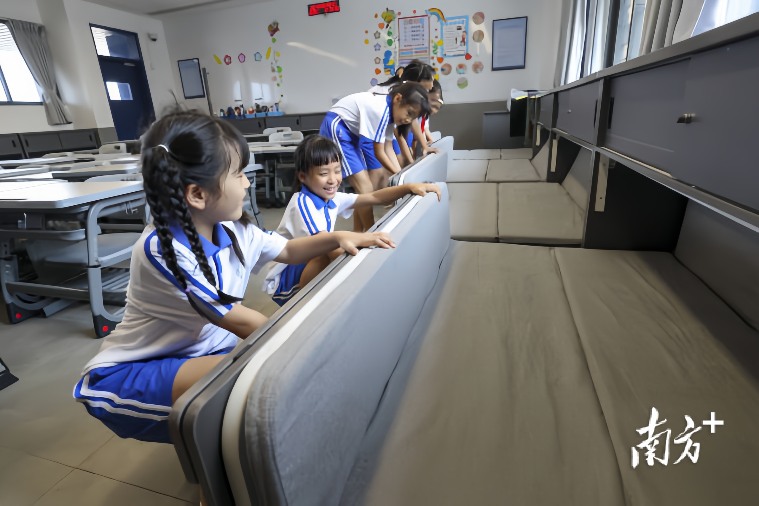 每到中午,值日的同学们便会把课桌椅挪到教室中心,轻轻一拉,藏在柜里的午休床就出现了。他们再从抽屉里取出被子、枕头和眼罩,只需10分钟,教室就会变成安静的午休室。