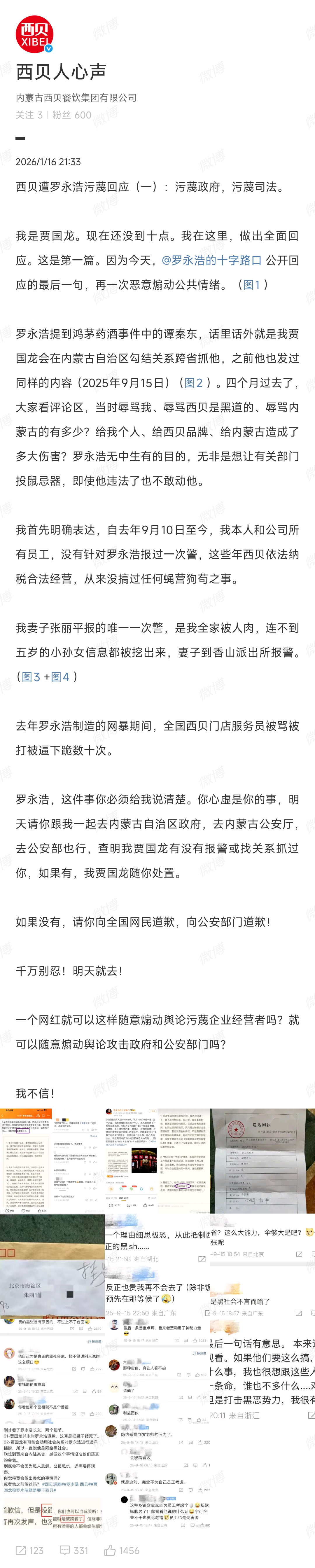 1月16日,21时33分,贾国龙通过“西贝人心声”账号发布首条“西贝遭罗永浩污蔑回应”,称自己并未在内蒙古自治区勾结关系跨省抓罗永浩。以下为全文内容: