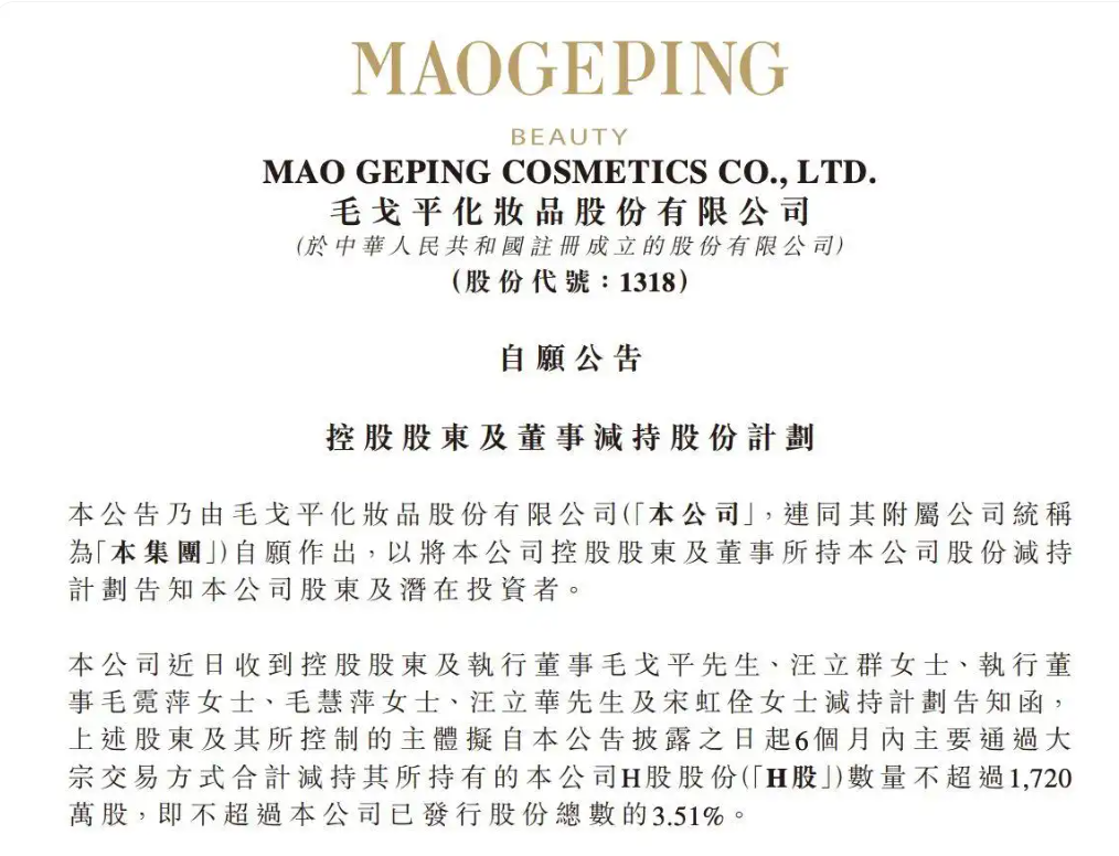上市刚满一年,毛戈平化妆品股份有限公司(HK01318,以下简称“毛戈平股份”)控股股东及多位执行董事计划进行集体减持。