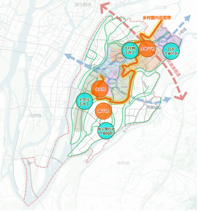 该示范带全长18公里,覆盖31平方公里区域,串联起昌平、大岭丫、闸口、厚德、北永、永庆、南城、大罗沙8个村,途经北海河、思贤河、厚德河、东江南支流等水系,让昔日的普通村庄变为网红打卡地。