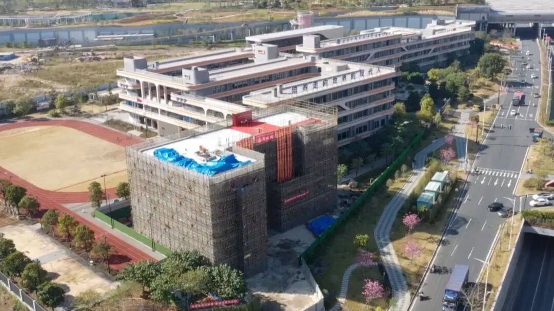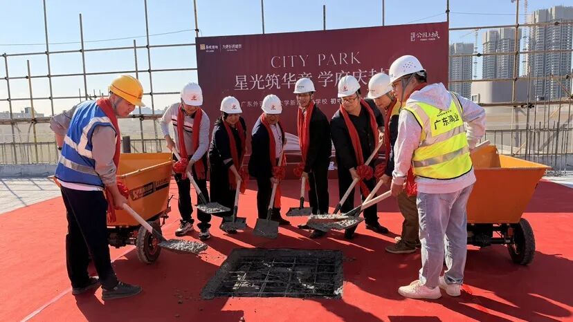 “未来,我们将依托新教学场地,重点打造外语特色课程与科创实践课程,助力学生实现全面发展,为区域教育高质量发展贡献力量。”广外新塘实验学校副校长王秀峰表示,新教学楼的封顶对初中部而言意义重大。新场地将从两方面为学校发展赋能:一方面有效扩充办学空间,为特色课程开展提供坚实硬件支撑;另一方面,专业化功能室的设置将精准匹配“全人教育”办学理念,让学生在实验操作、实践活动中提升综合素养。