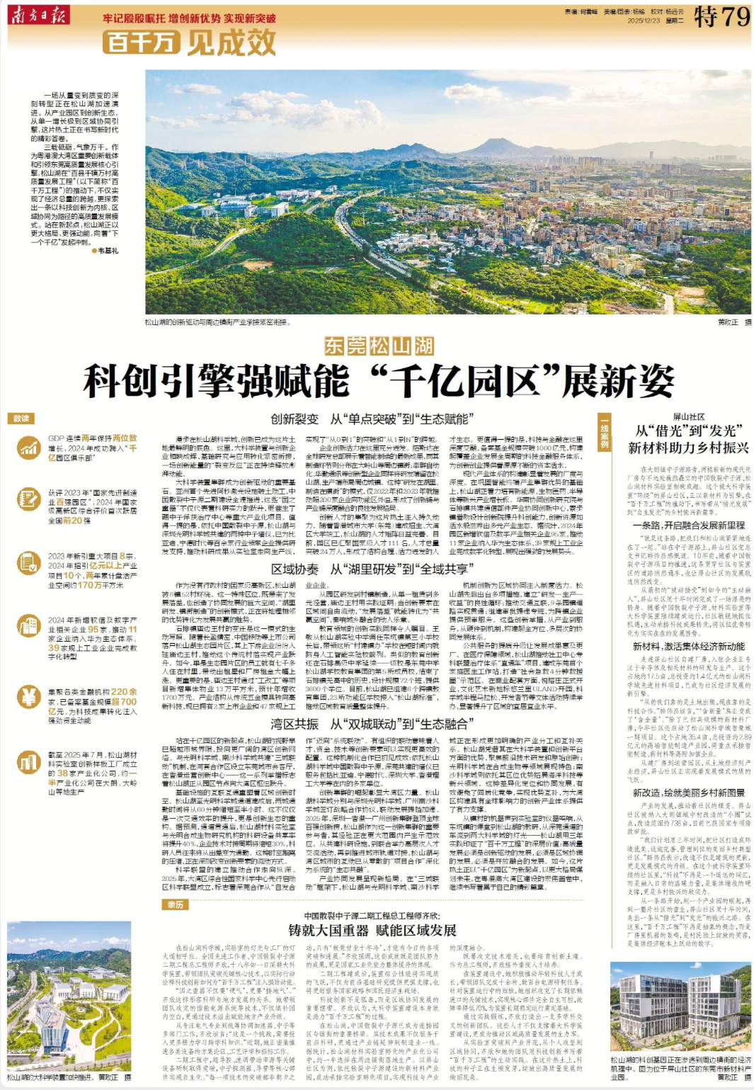 从镇村的机器声到实验室的仪器鸣响,从东坑镇的课堂到松山湖的教研,从深莞通道的车流到两大科学城的灯光——松山湖用三年实践印证了“百千万工程”的深层价值:高质量发展必须是创新驱动的发展,必须是区域协调的发展,必须是开放融合的发展。如今,这片热土正以“千亿园区”为新起点,以更大格局谋划未来,在粤港澳大湾区建设的宏伟画卷中,继续书写着属于自己的精彩篇章。