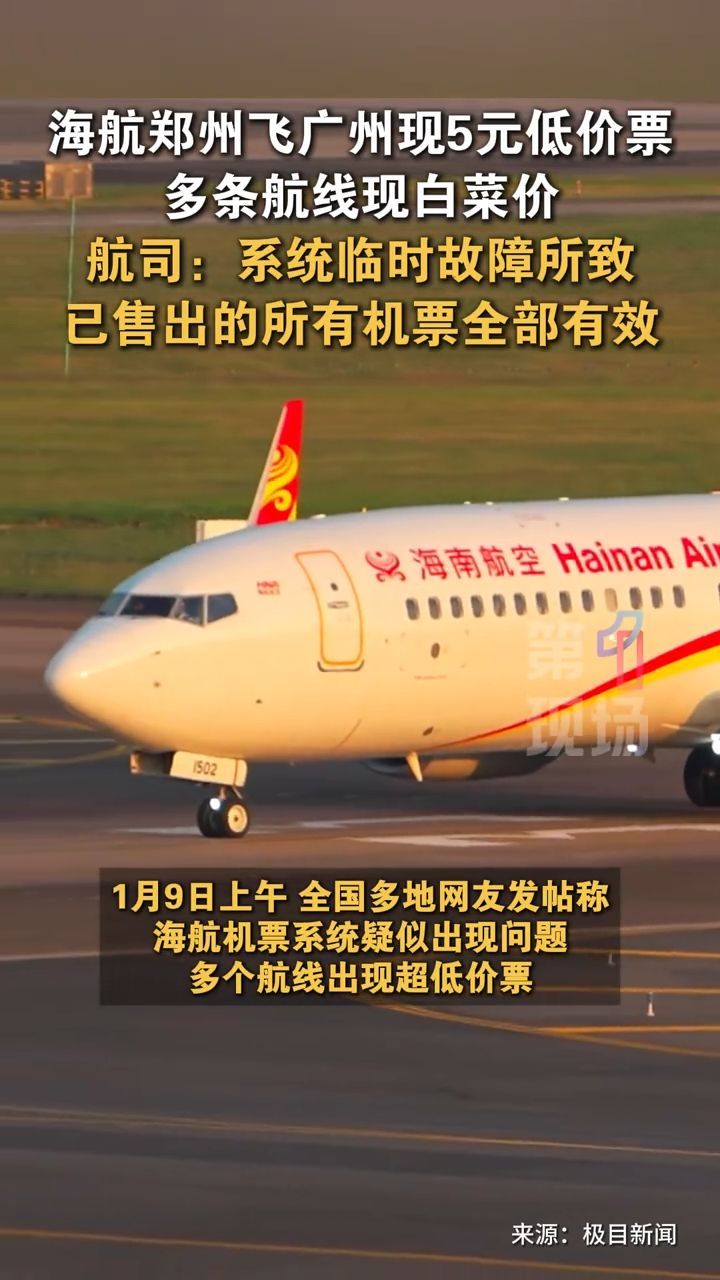 1月9日,海南航空发布公告:公司今日上午10时左右,因系统临时故障,部分航线机票价格显示异常,我们对此给广大旅客带来的不便深表歉意。在发现该情况后,我司已第一时间紧急排查处理并完成系统修复,目前均已恢复正常。在此期间,已售出的所有机票(支付成功并已出票)全部有效,旅客可正常使用。详情>>