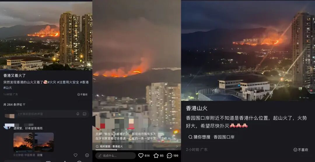 粉岭、上水以至深圳莲塘一带大批居民均清晰可见,不少深圳网友也在社交平台询问香港是不是发生山火了。