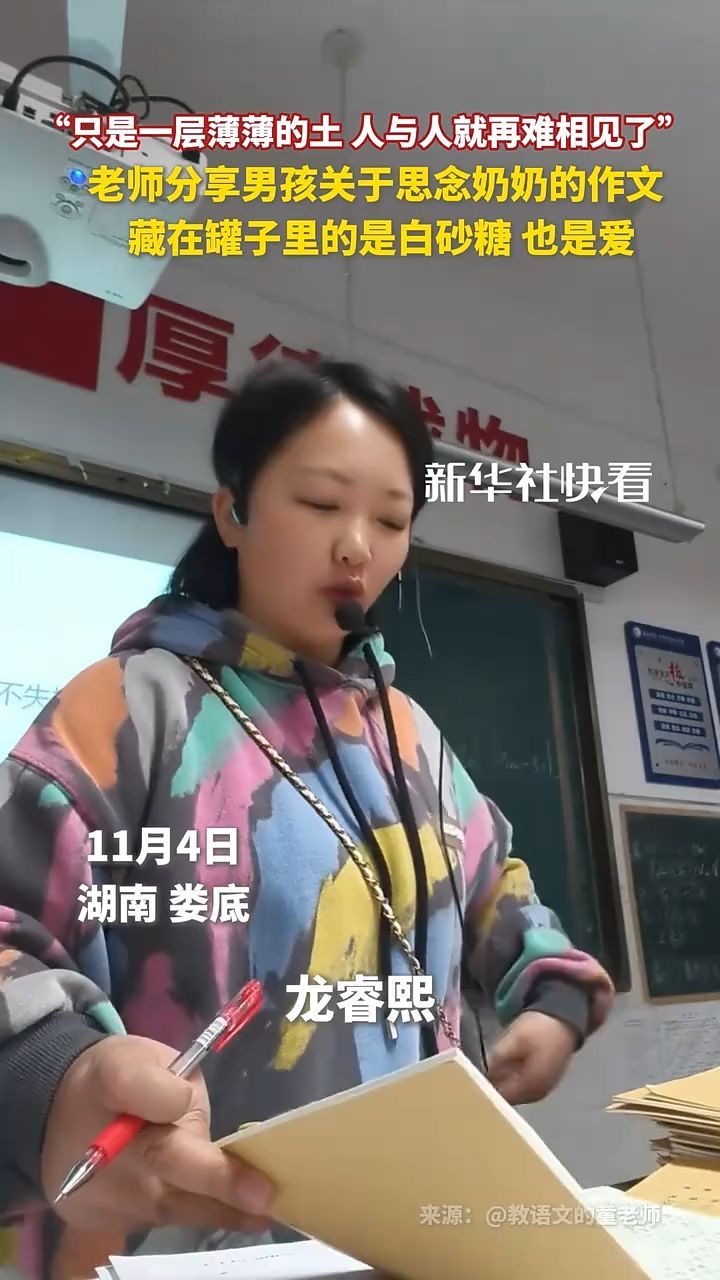 近日,湖南娄底,初三男生写的一篇怀念奶奶的作文《藏在罐子里的爱》短短两天在全网爆火,其中一句“只是一层薄薄的土,人与人就再难相见了”更是戳中千万网友泪点。