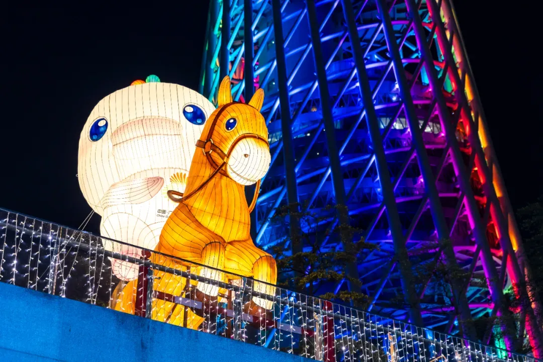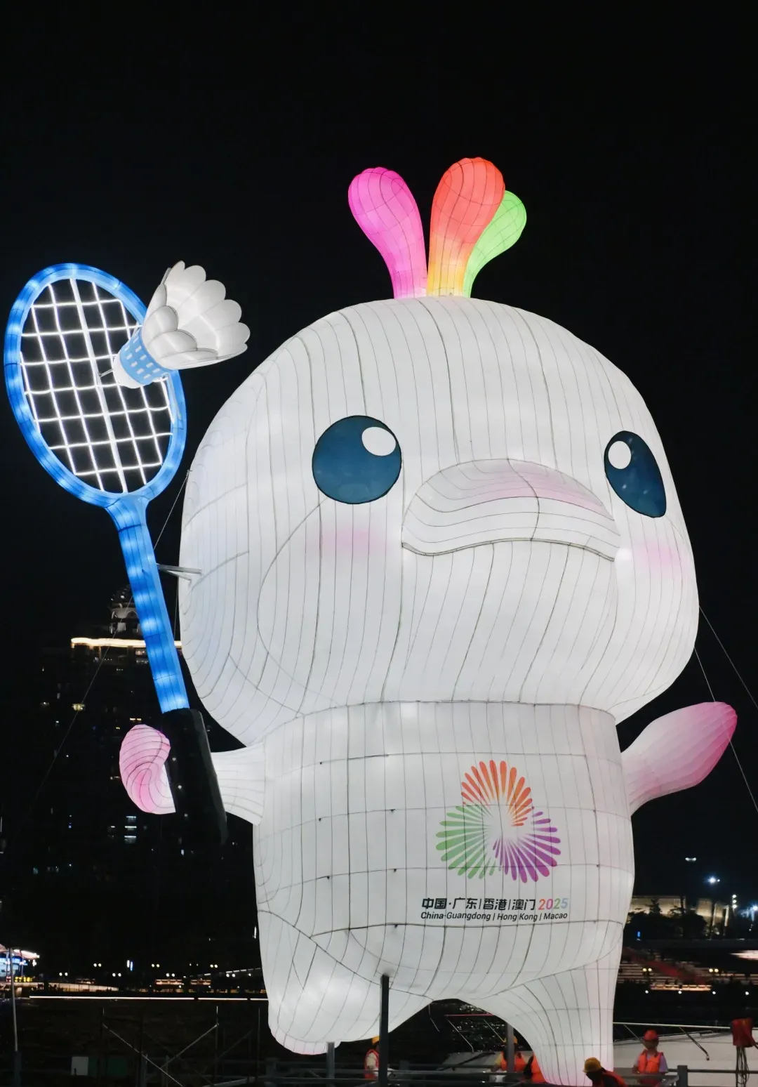 值得关注的是,本次吉祥物采用岭南非物质文化遗产——“彩扎”技艺制作。该技艺以竹篾为骨、色纸为衣,传承广府匠心,并与现代结构工艺相融合,实现了传统非遗与现代设计的创新对话。夜幕降临,灯光系统配合装置光影闪耀,使吉祥物在珠江夜色中焕发灵动光彩,成为展示广州文化魅力与艺术创意的又一城市符号。