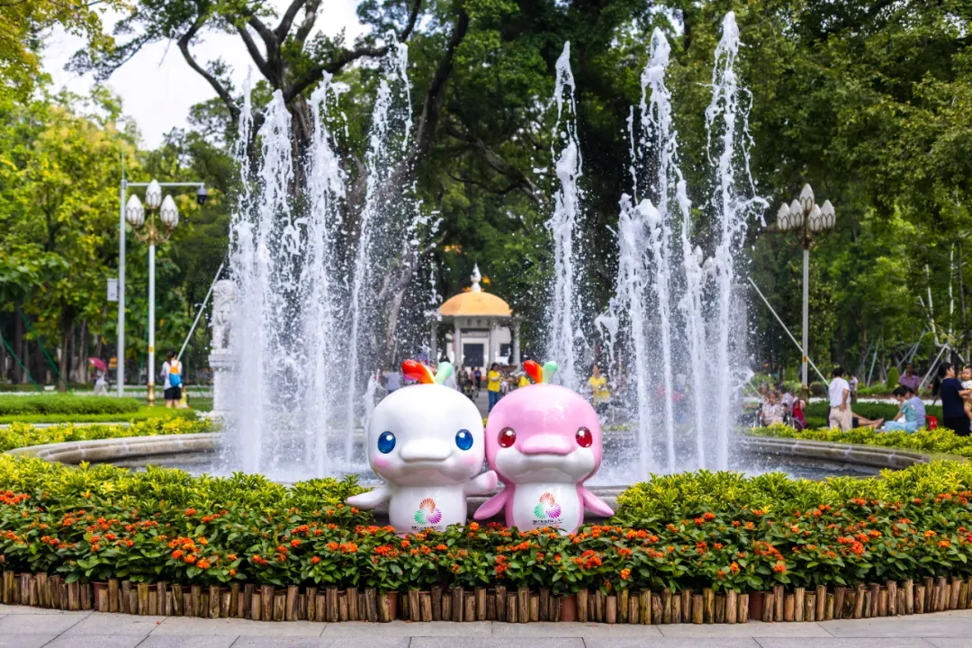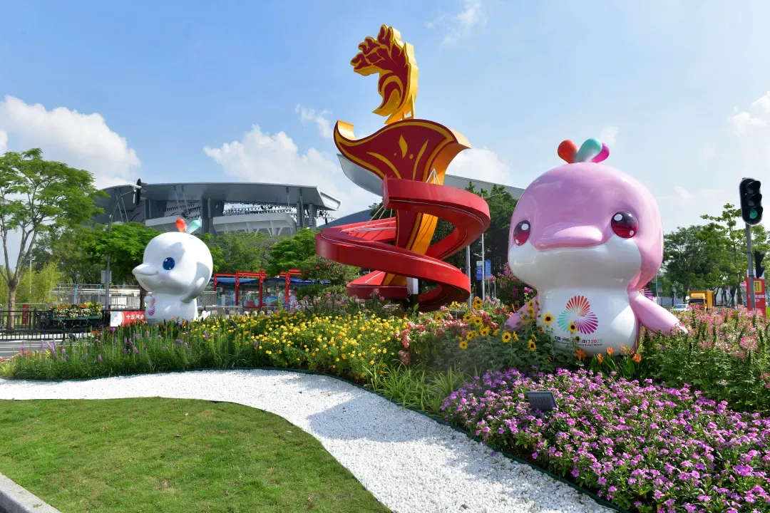 天河优托邦前的绿化带上放置了全运会吉祥物。图/GZphotos