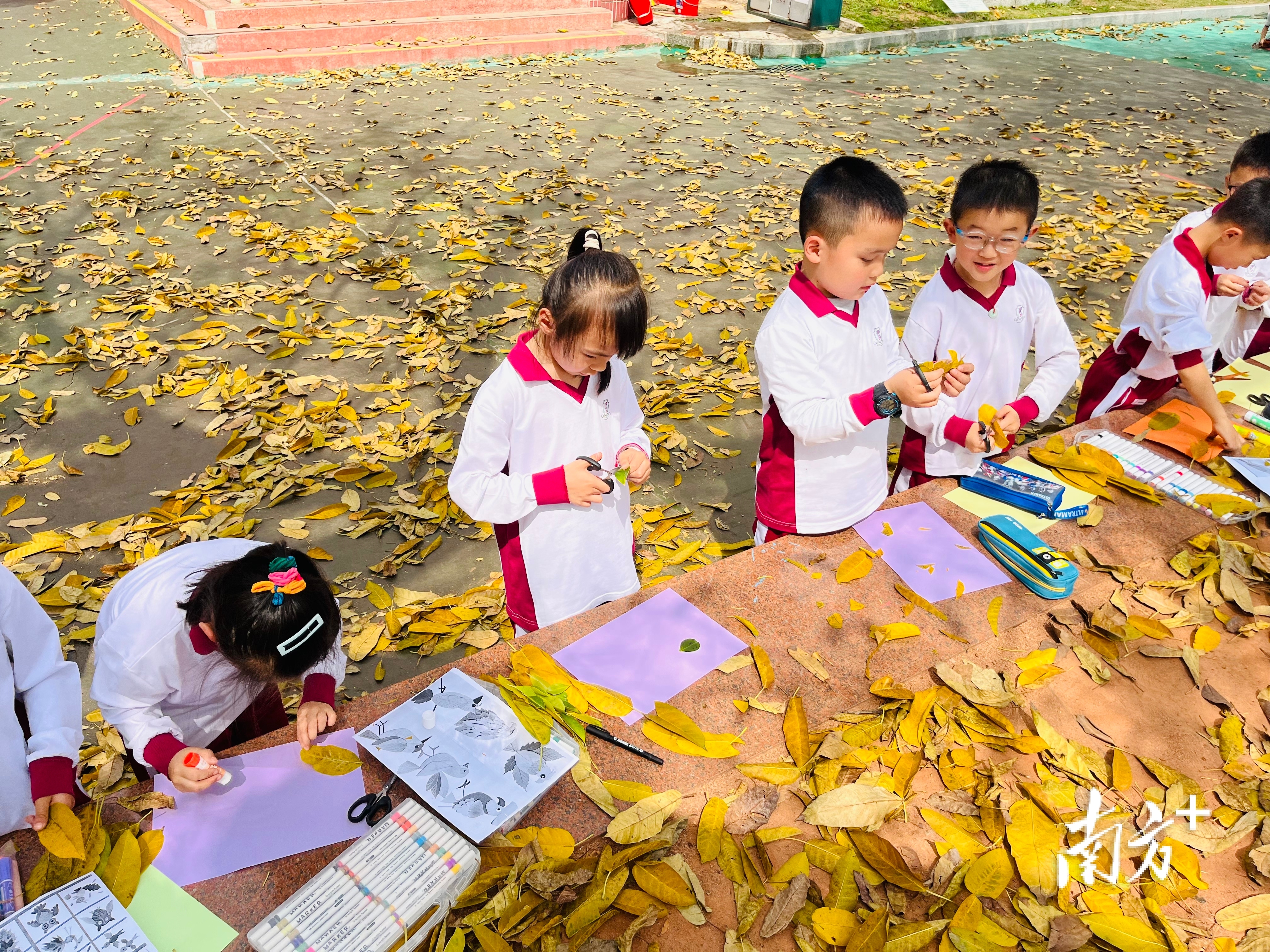 在三水区实验小学,飘落的树叶却并未被清扫,反而成为了自然美育课的生动素材。老师们就地取材,将课堂搬至树下,让学生在自然中感知美、创造美,探索起跨学科教学的创新实践。