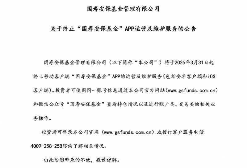 国寿安保基金宣布将终止旗下App的运营及维护