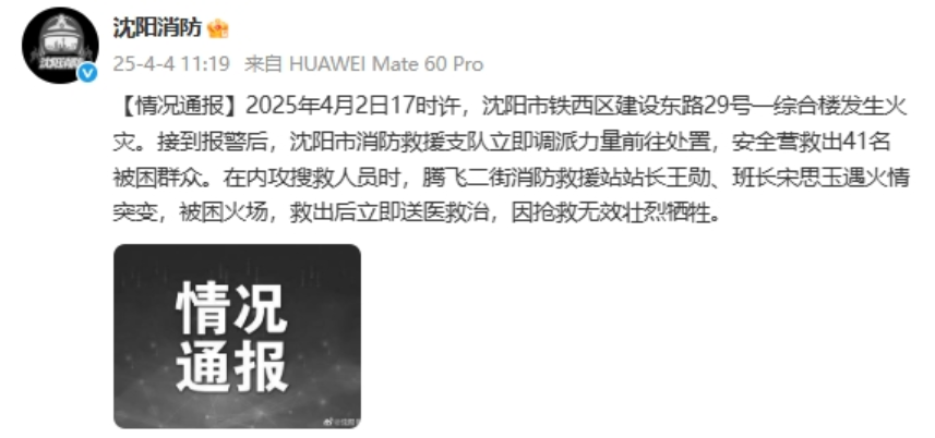 据沈阳消防消息,2025年4月2日17时许,沈阳市铁西区建设东路29号一综合楼发生火灾。接到报警后,沈阳市消防救援支队立即调派力量前往处置,安全营救出41名被困群众。在内攻搜救人员时,腾飞二街消防救援站站长王勋、班长宋思玉遇火情突变,被困火场,救出后立即送医救治,因抢救无效壮烈牺牲。 编辑 辜继漫 订阅后可查看全文(剩余80%)