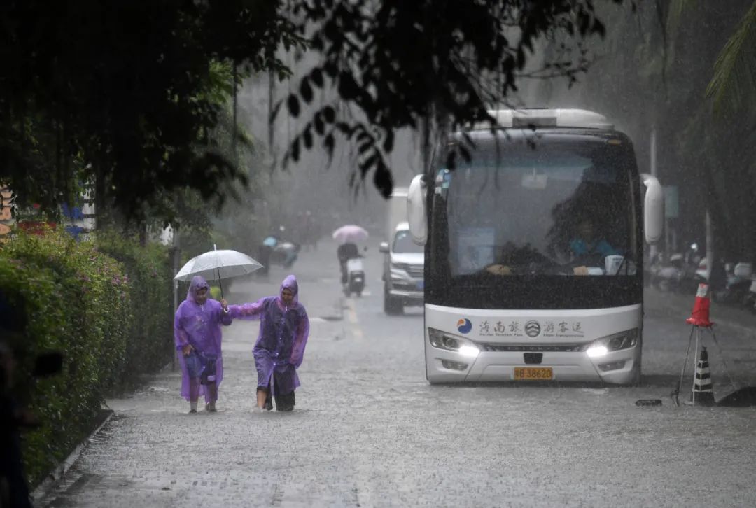 10月28日,在海南省三亚市,行人、车辆经过积水路段。新华社记者 赵颖全 摄