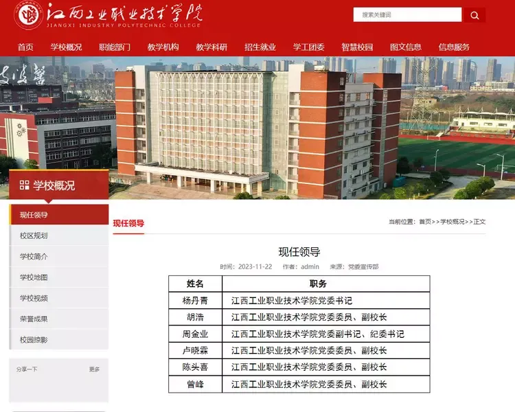 更新后的江西工职院网站“现任领导”栏目显示,杨丹青任江西工职院党委书记,陈头喜、曾峰均任校党委委员、副校长。校长一职目前空缺,胡浩、周金业、卢晓霖继续担任原职。