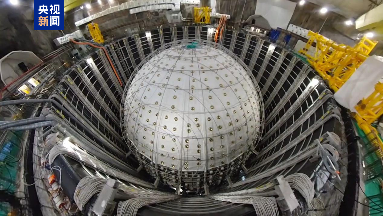 布满中心探测器内壁的光电倍增管用于探测中微子被液体闪烁体“俘获”时产生的闪烁光,将光信号转换为电信号输出,供科研人员开展研究工作。相比目前国际上的最好水平,江门中微子中心探测器的液体闪烁体体积增大了20倍,光电子产额增大了3倍,能量分辨率达到前所未有的3%。
