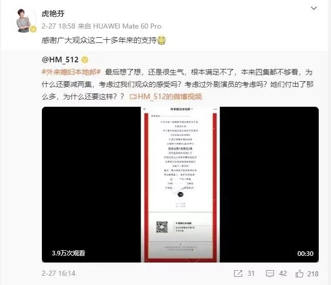 也有网友在评论区吐槽《外来媳妇本地郎》如今的剧本质量有所下降,虎艳芬则回复:“马上就会结束了,请不要着急。”“天下哪有不散的宴席。”因此也引起了网友猜测:《外来媳妇本地郎》真的要大结局了吗?