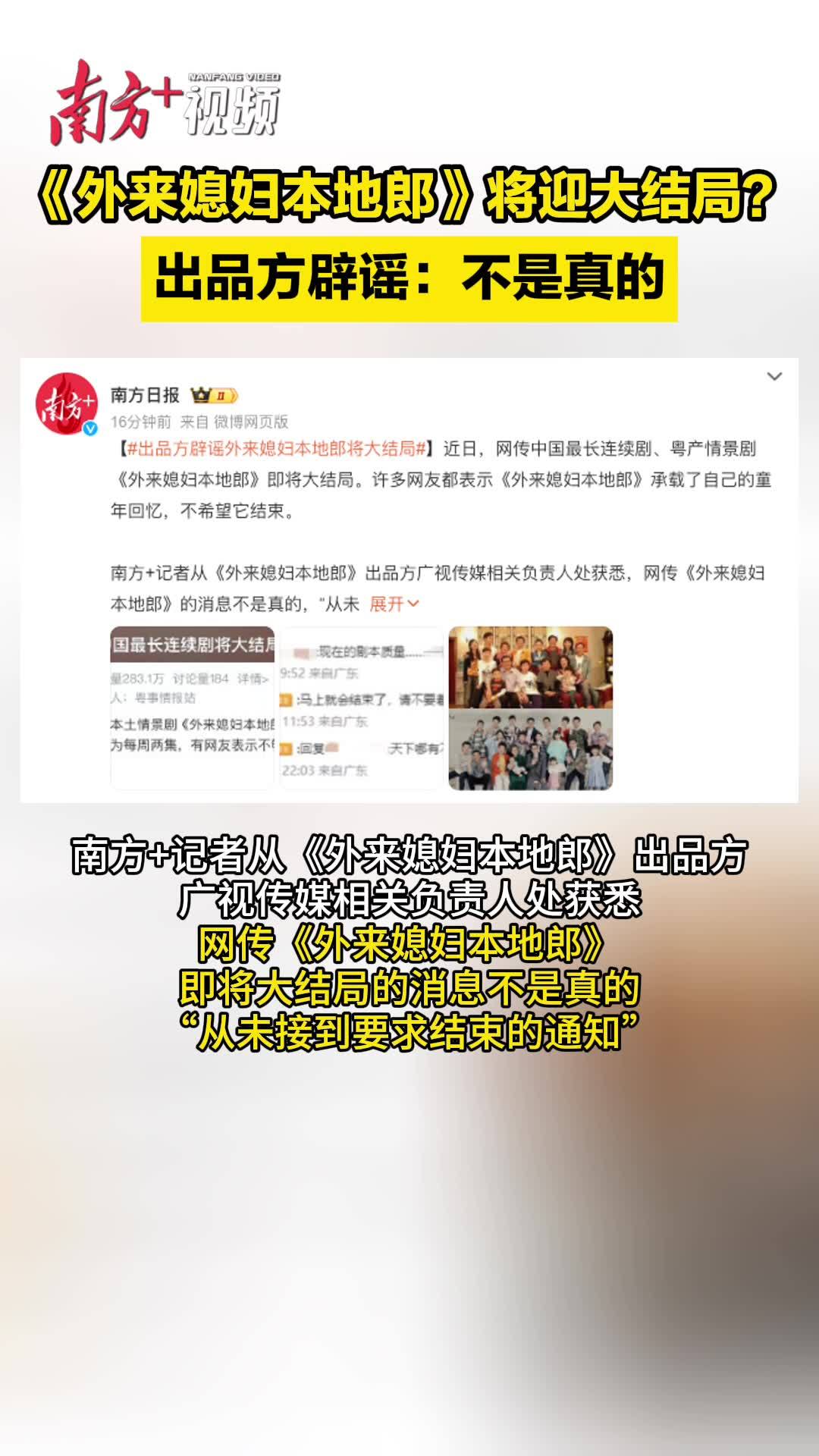 南方+记者从《外来媳妇本地郎》出品方广视传媒相关负责人处获悉,网传《外来媳妇本地郎》即将大结局的消息不是真的,“从未接到要求结束的通知”。