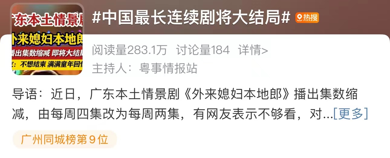 近日,网传中国最长连续剧、粤产情景剧《外来媳妇本地郎》即将大结局。许多网友都表示《外来媳妇本地郎》承载了自己的童年回忆,不希望它结束。