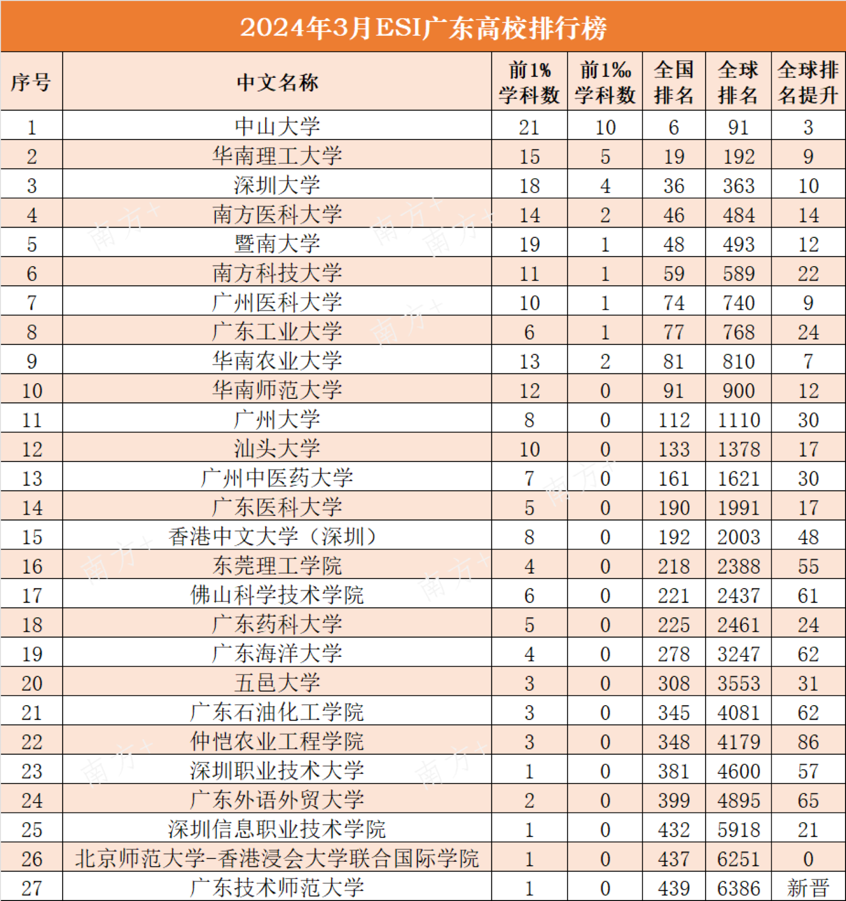 有学科进入全球前1‰的9所广东高校,包括中山大学、华南理工大学、深圳大学、南方医科大学、暨南大学、南方科技大学、广州医科大学、广东工业大学、华南农业大学。