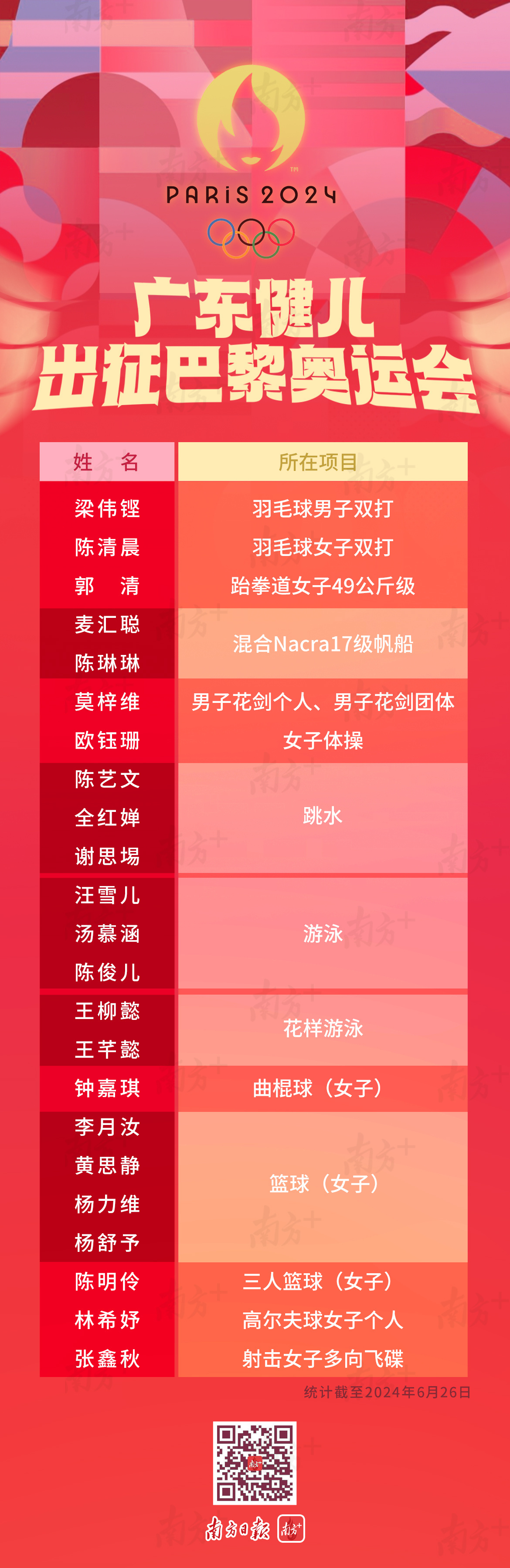 巴黎奥运会将于7月26日开幕,如今距开幕还有不到一个月的时间,中国体育代表团各项目的参赛名单陆续揭晓。截至6月26日,在已公布奥运名单的17个大项24个分项中,包括全红婵在内的23名广东健儿,将参与10个大项13个分项的争夺。一起为他们加油助威>>