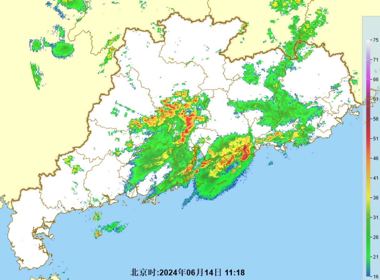 降雨方面,截至14日11时18分,雨主要下在珠三角、粤东,其中广州、深圳、惠州南部、珠海等地降雨尤其大。