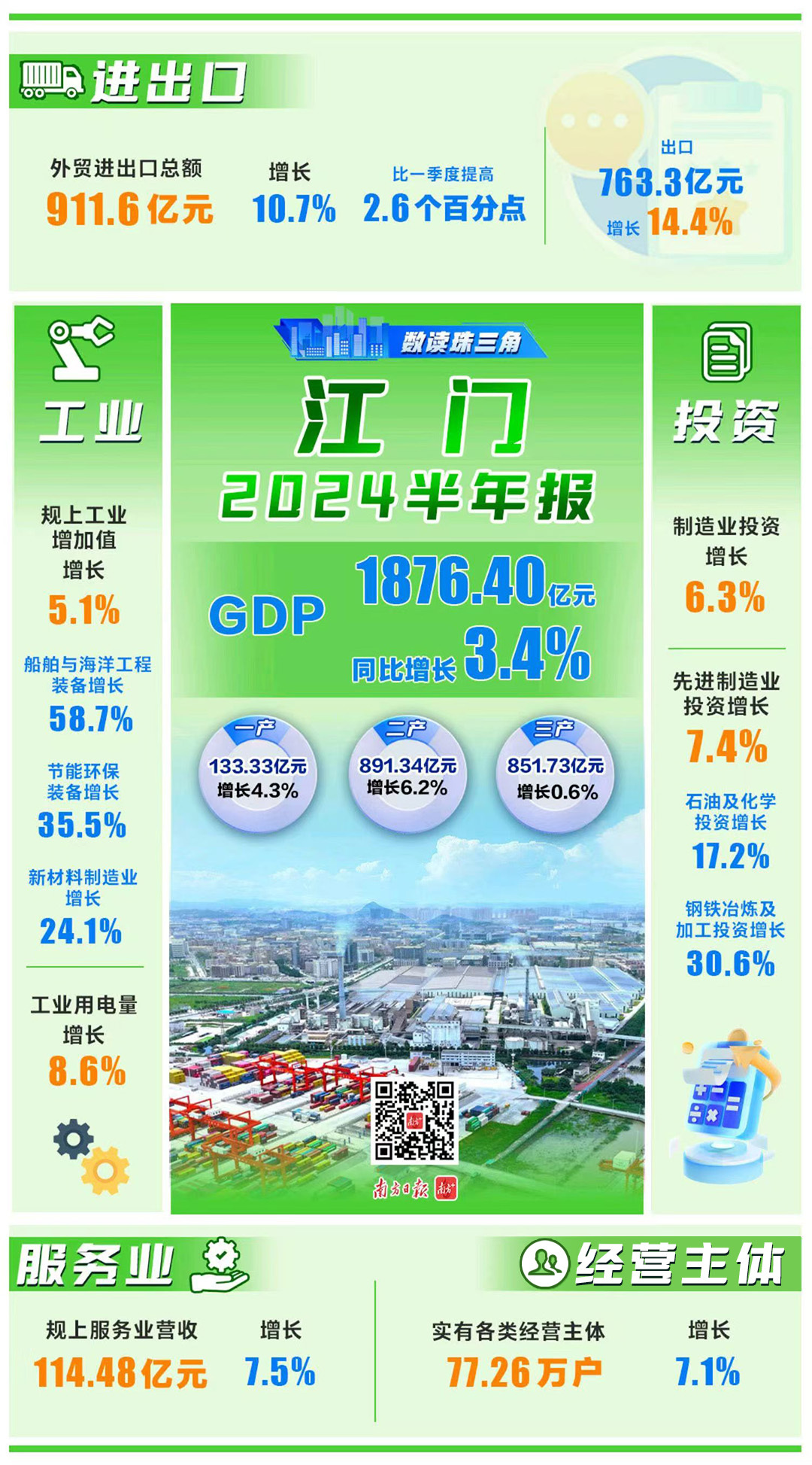 7月30日,江门市统计局公布2024年上半年江门主要经济指标运行情况。根据广东省地区生产总值统一核算结果,2024年上半年江门地区生产总值为1876.40亿元,同比增长3.4%。总体呈现出生产端稳中有进,需求端外强内弱的态势。