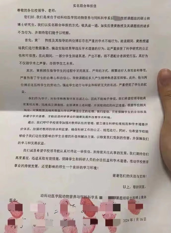 11名学生称,他们是动科动医学院动物营养与饲料科学系黄某某教授课题组的硕士和博士研究生,联合实名举报黄某某及其课题组的诸多不当行为。其中,长达125页的举报材料,主要阐述了黄某某指导的3名博士生和13名硕士生的学术论文中存在的问题,包括“篡改编造实验数据、拼接修改实验图标及数据、改动实验结果、抄袭论文”等,以及黄某某“操纵同行评审、克扣学生劳务费、对学生进行人身攻击和辱骂”等行为。