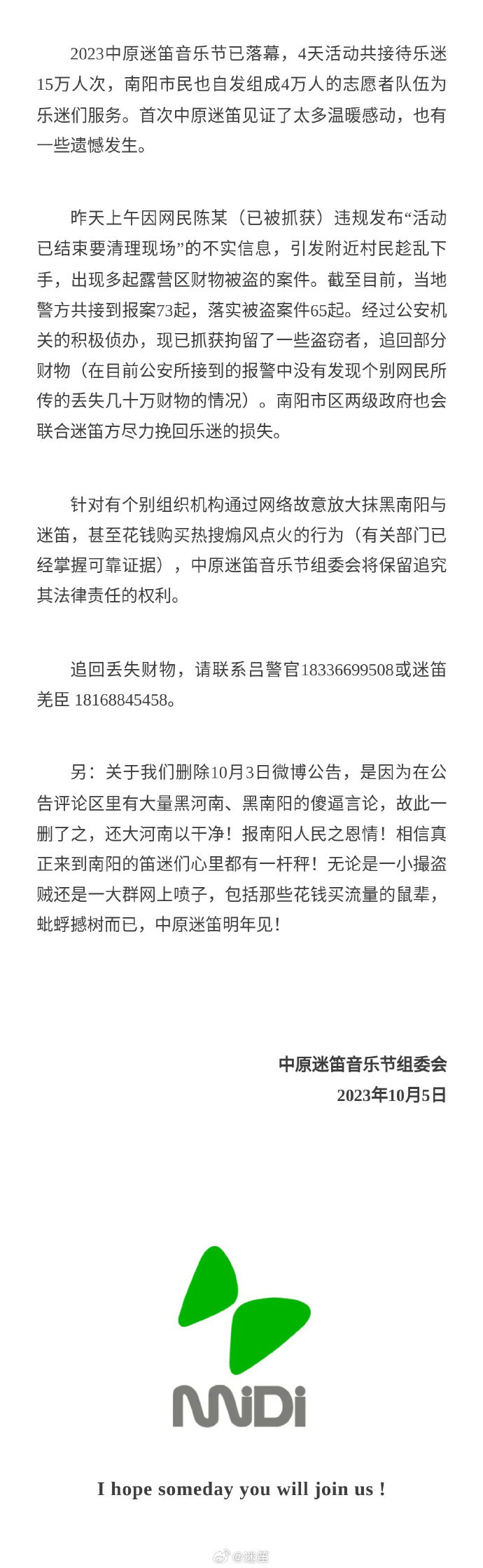 10月5日,迷笛音乐节官方发布消息称:昨天上午因网民陈某(已被抓获)违规发布“活动已结束要清理现场”的不实信息,引发附近村民趁乱下手,出现多起露营区财物被盗的案件。截至目前,当地警方共接到报案73起,落实被盗案件65起。经过公安机关的积极侦办,现已抓获拘留了一些盗窃者,追回部分财物(在目前公安所接到的报警中没有发现个别网民所传的丢失几十万财物的情况)。南阳市区两级政府也会联合迷笛方尽力挽回乐迷的损失。