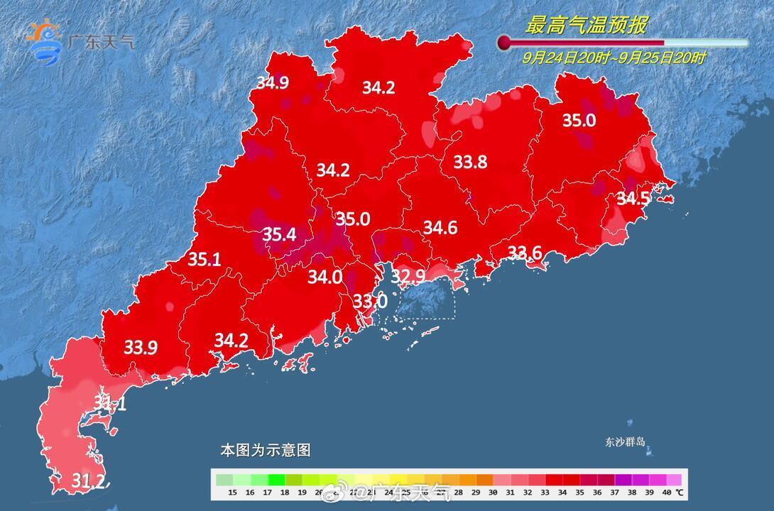 最高气温:韶关北部、清远北部和南部沿海市县31℃~33℃,其余大部分市县33℃~34℃,部分市县35℃左右。