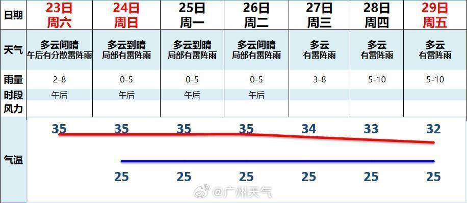未来几天,广州以晴热为主,午后偶有局部雷阵雨来打扰,下周三起雷雨趋明显。