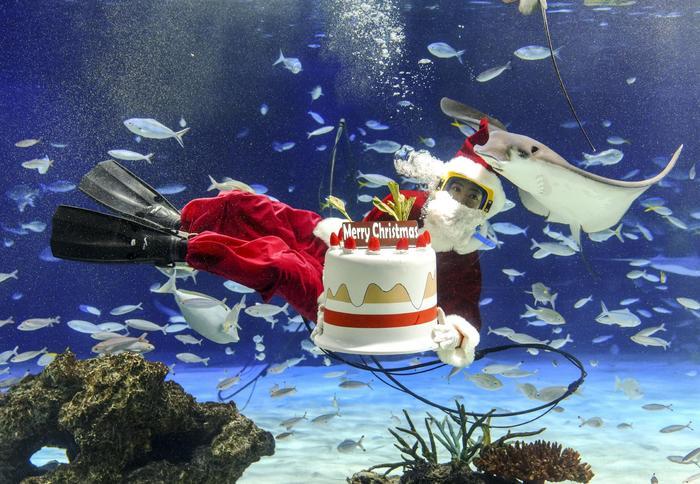 △12月14日,一名身着圣诞老人服饰的潜水员在东京阳光水族馆为喂食表演排练。新华社发