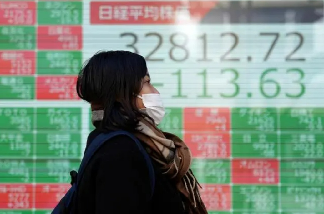 △12月14日,行人经过东京街头的一块电子股指显示屏。新华社发
