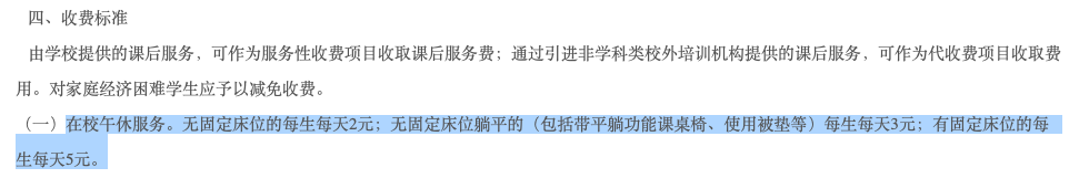 记者从东莞市发改局官网检索到《关于我市义务教育阶段课后服务收费标准的通知》,其中明确在校午休服务的收费标准为:无固定床位的每生每天2元;无固定床位躺平的(包括带平躺功能课桌椅、使用被垫等)每生每天3元;有固定床位的每生每天5元。