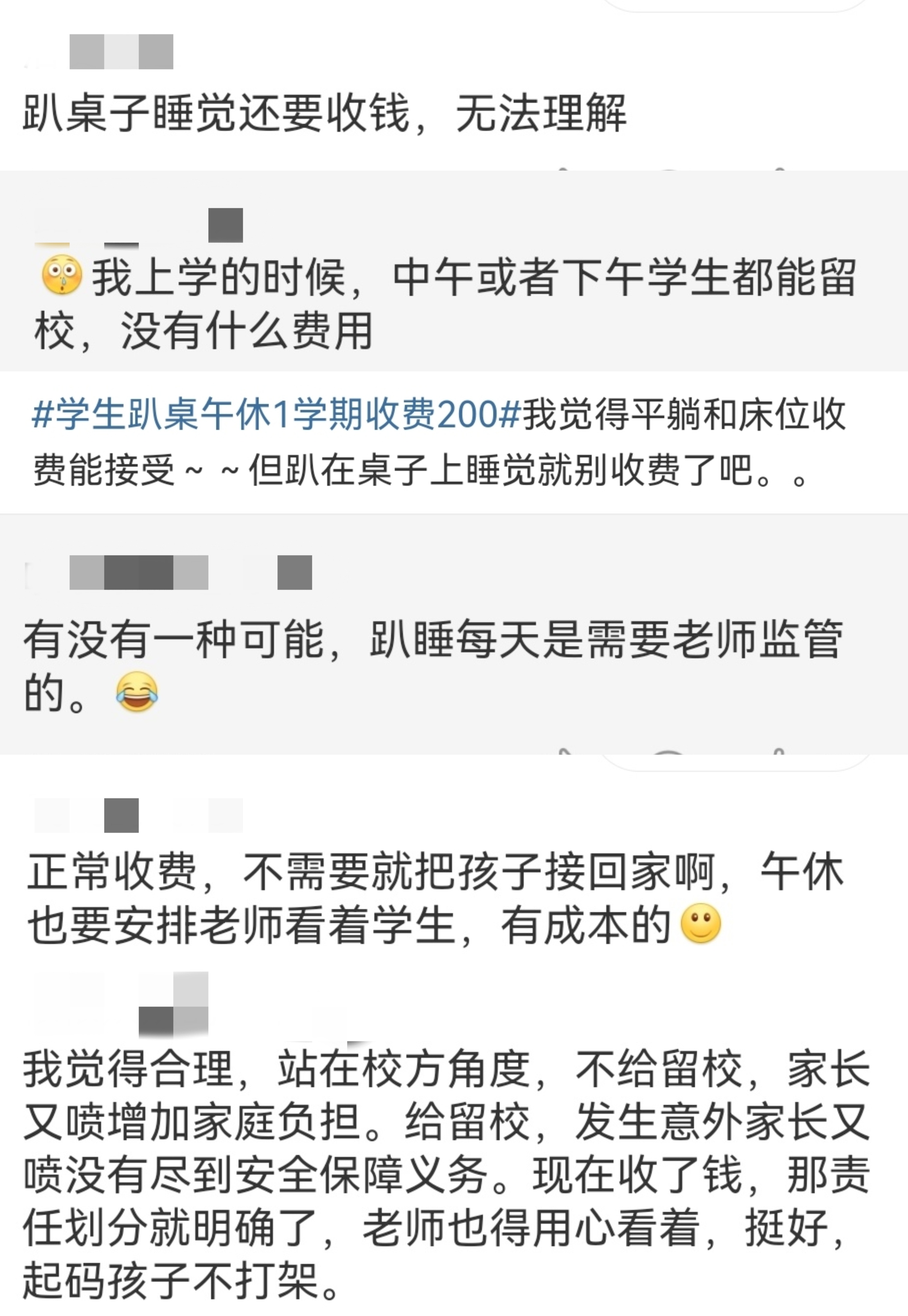 对此,有网友表示不解:“我们上学时候经常趴桌子上睡觉,从来没听过要收费”;也有网友表示理解:“午休也要安排老师看着学生,有成本的”……