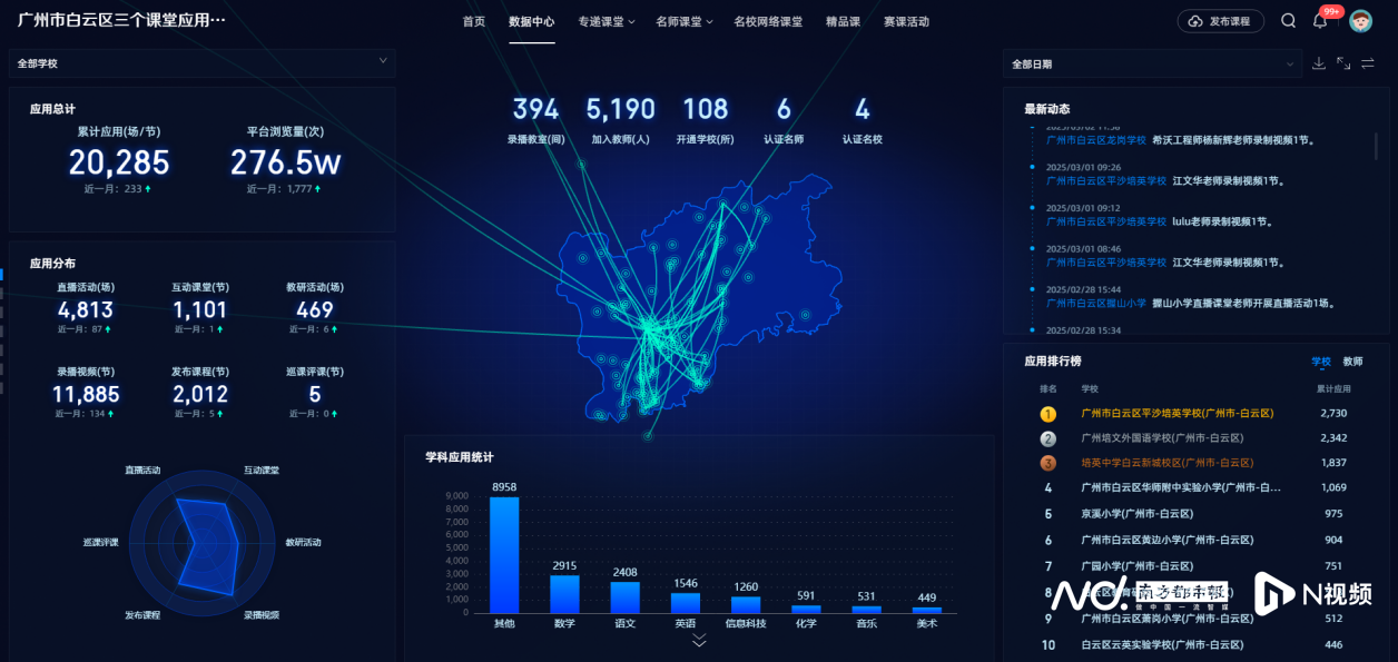 白云区三个课堂应用平台数据看板。据悉,白云区智慧教育案例 《破除城乡二元结构,智慧教育促进城乡一体化实践》、《“一横十纵”推进城乡教育一体化融合发展》、《白云教育的数字化转型实践——无感知AI数字课堂引领教育创新与高质量发展》分别被评为2022、2023、2024年度教育部智慧教育优秀案例,《区域教育数字基座平台建设与可信应用实践》 入选教育部典型案例;在教育部、省市多个场合分享白云经验,为其他地区提供了宝贵的经验和借鉴。