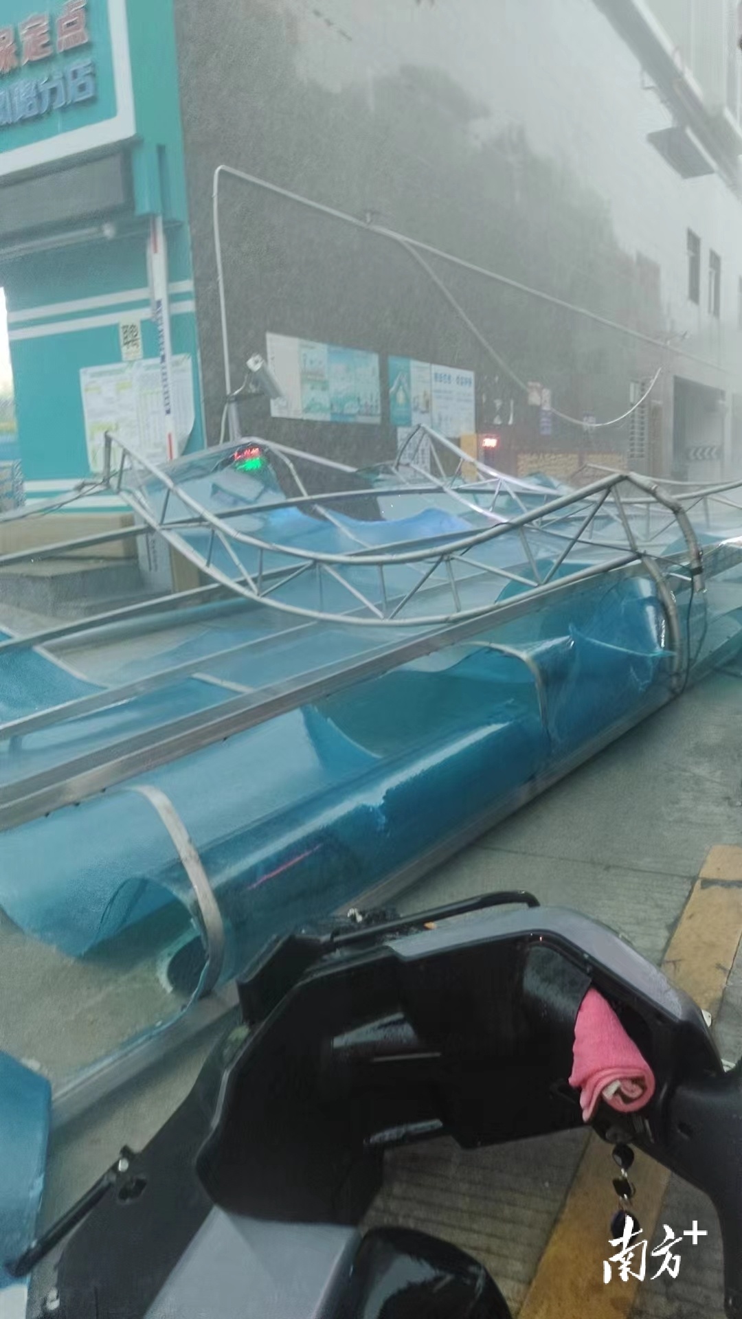河源遭遇强对流天气,紫金县降下大暴雨并伴有12级短时大风,导致县城东风路与东风路一巷交叉口西40米鸿翔华庭小区车辆进出口处一挡雨棚倒塌。