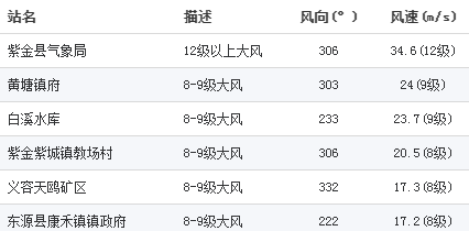 此外,紫金县气象局气象站录得全市最大阵风34.6米/秒(12级),紫城镇出现小冰雹。全市平均雨量为48.7毫米,50~100毫米的有87站,超过100毫米的有14站,东源漳溪录得最大降雨量138.5毫米和最大小时雨强79.0毫米,其余县区最大雨量如下(毫米):源城41.6;江东新区37.6;和平东水78.3;连平元善74.6;龙川田心130.2;紫金紫城63.4。
