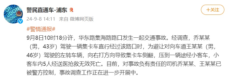 9月8日10时18分许,华东路集海路路口发生一起交通事故。经调查,乔某某(男,43岁)驾驶一辆集卡车直行经过该路口时,为避让对向车道王某某(男,46岁)驾驶的左转车辆,向右打方向导致集卡车侧翻,压到一辆途经小客车,小客车内5人经送医抢救无效死亡。目前,对事故负有责任的司机乔某某、王某某已被警方控制,事故调查工作正在进一步开展中。