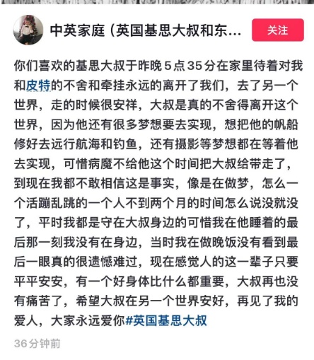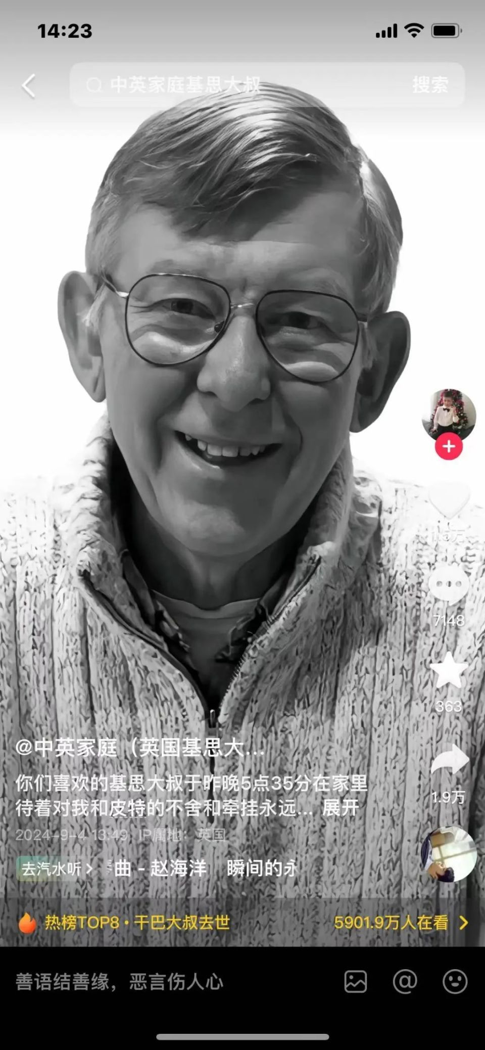 9月4日,据抖音“中英家庭(英国基思大叔和东北大姨)”发布作品称:你们喜欢的英国基思大叔永远离开了我们。