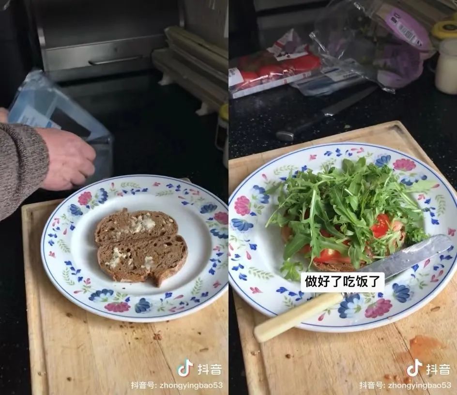 视频中一位英国大叔用餐刀咔呲咔呲、边切边磨费力切下两片硬邦邦的面包片,然后用餐刀颤巍巍刮出黄油,抹在面包上,盖上牛油果、培根、几根菜叶,塞进嘴里,费劲儿咬下,用力咀嚼,大叔吃得津津有味,网友却纷纷表示:第一次见到这样的干巴lunch“烂吃”、咽下去的时候脖子得伸出二里地、这午餐色香味“扣完”......