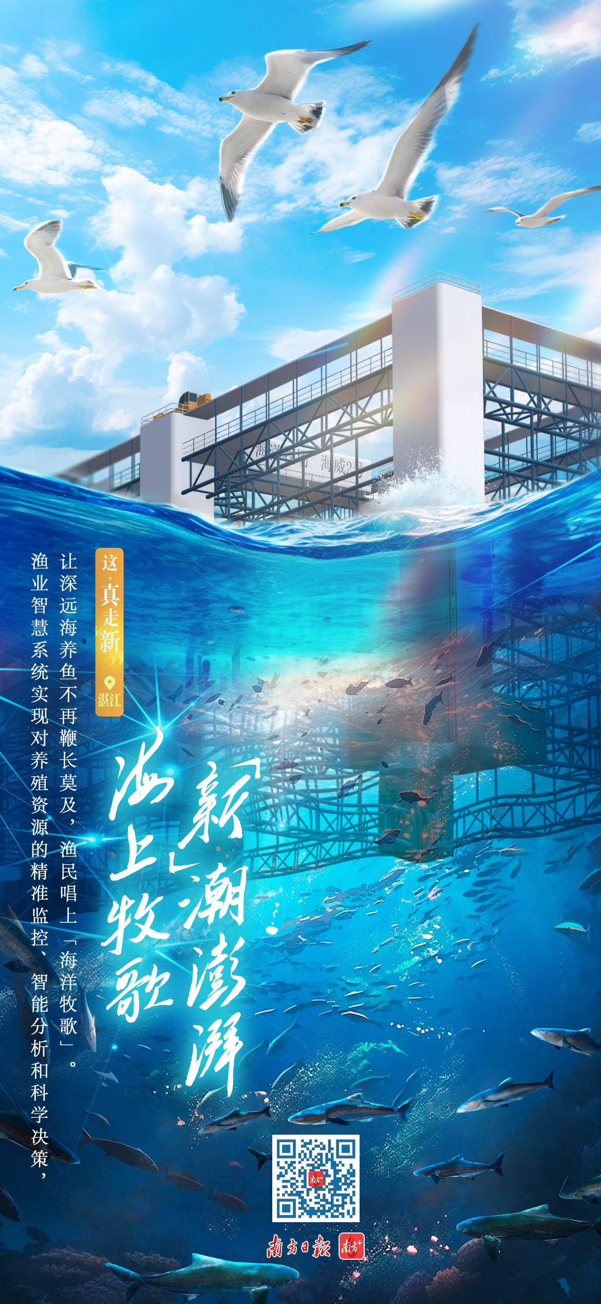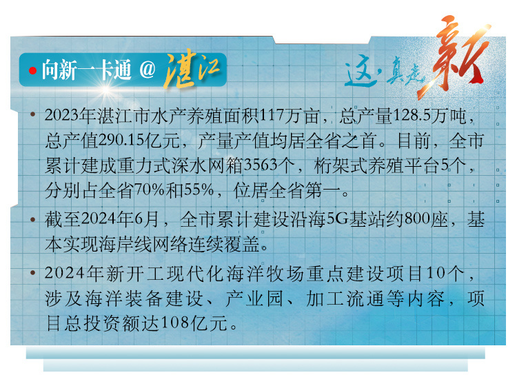 如今,智能化深远海养殖平台在湛江各海洋牧场星罗密布。从全省最大的桁架式养殖平台“恒燚1号”,到正在建设中的全球首例悬浮定深高抗台风养殖平台“海塔1号”、全球首创漂浮式动力定位养殖平台“湛江湾一号”……