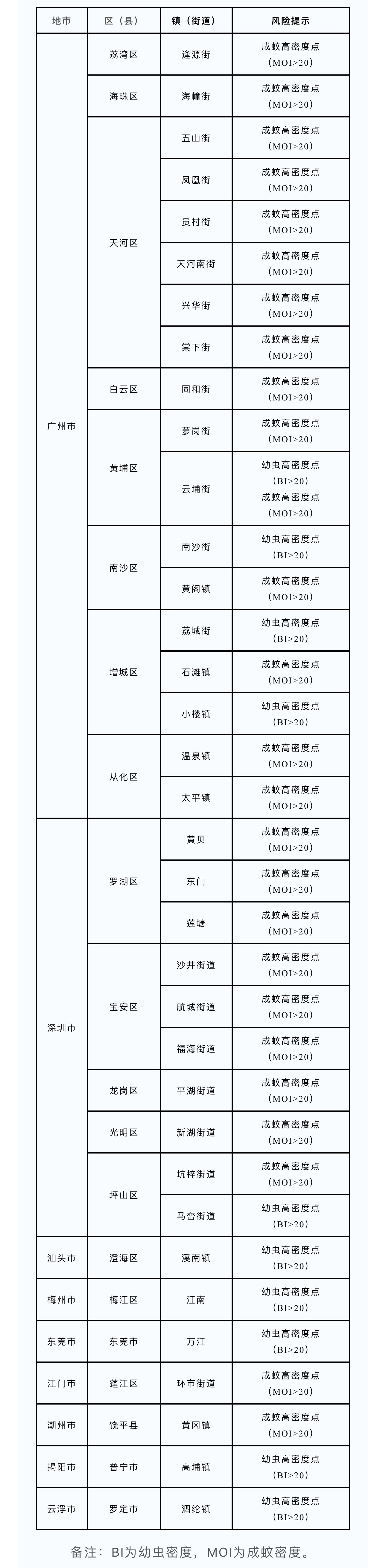 每年的6—11月是广东省登革热流行季,所处地区的媒介伊蚊密度越高,发生登革热流行的风险越高。