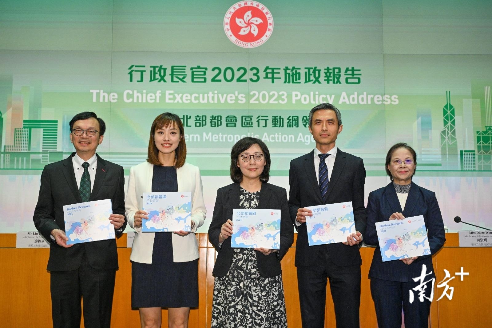 香港特区政府发展局局长甯汉豪(中)30日联同北部都会区统筹办事处主任丘卓恒(右二)等人举行记者会,公布《北部都会区行动纲领》。