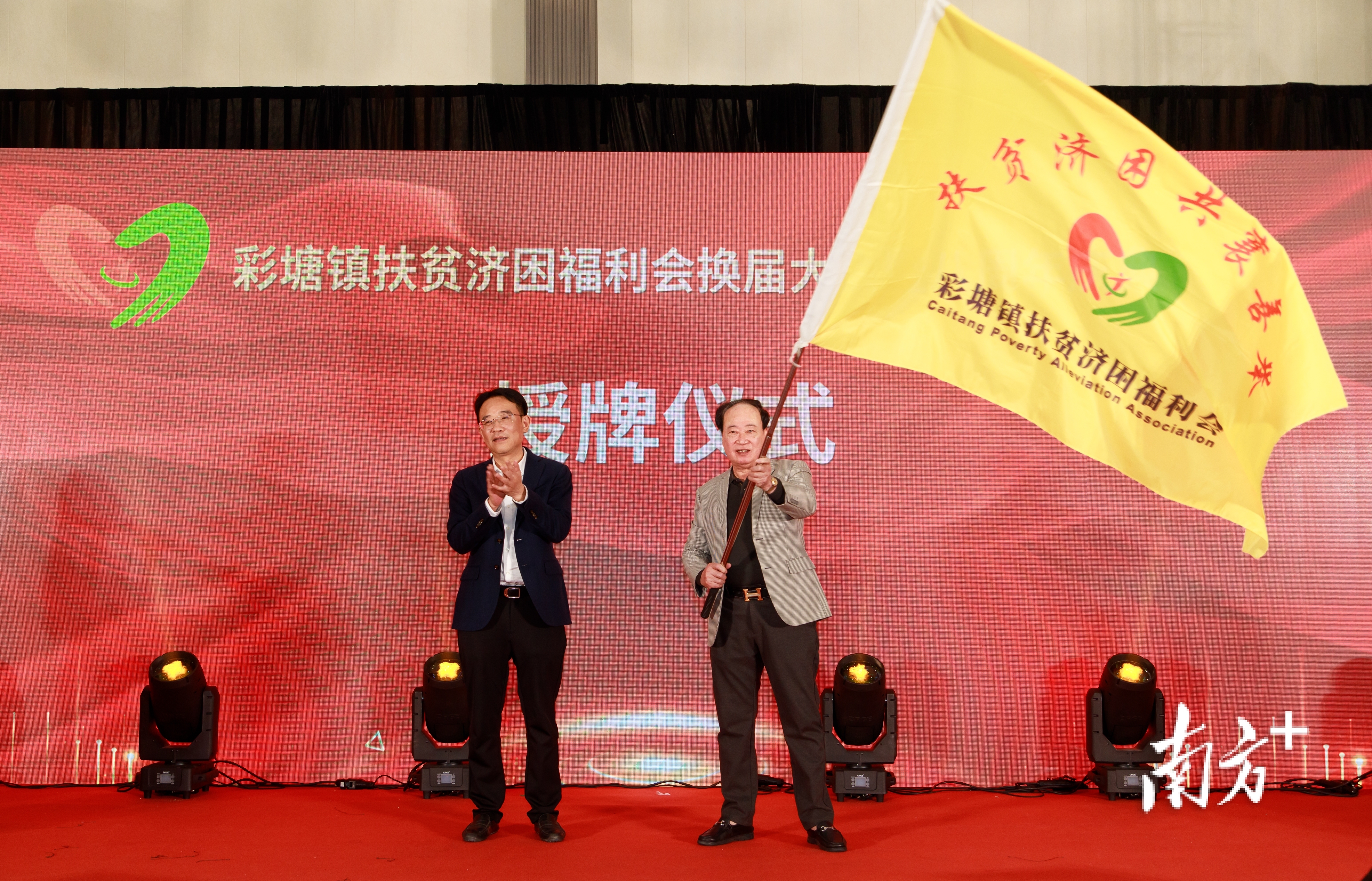 潮安区人民政府副区长、彩塘镇党委书记李汉钿为福利会第三届会长翁友茂(右)授牌和传递福利会会旗。受访者供图